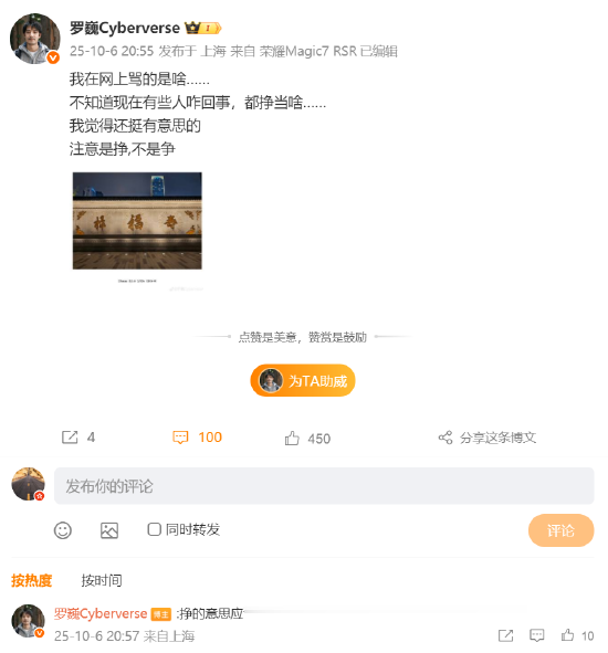10月6日晚间,罗巍在微博发文疑似回应此事,他表示:“我在网上骂的是啥……不知道现在有些人咋回事,都挣当啥……我觉得还挺有意思的,注意是挣,不是争。”他还在评论区补充称,“挣的意思应该是收钱了,不然为啥这么前仆后继,奋勇争先”。